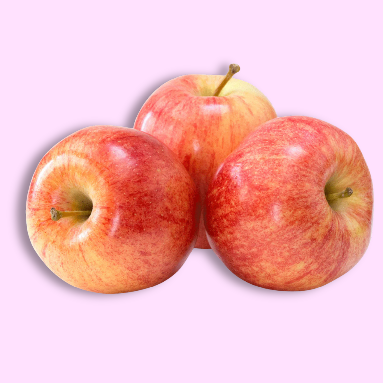Fuji apples are large, crisp, and juicy with a balanced sweet flavor. They have a dense texture and a yellowish-red skin with a slightly speckled appearance.