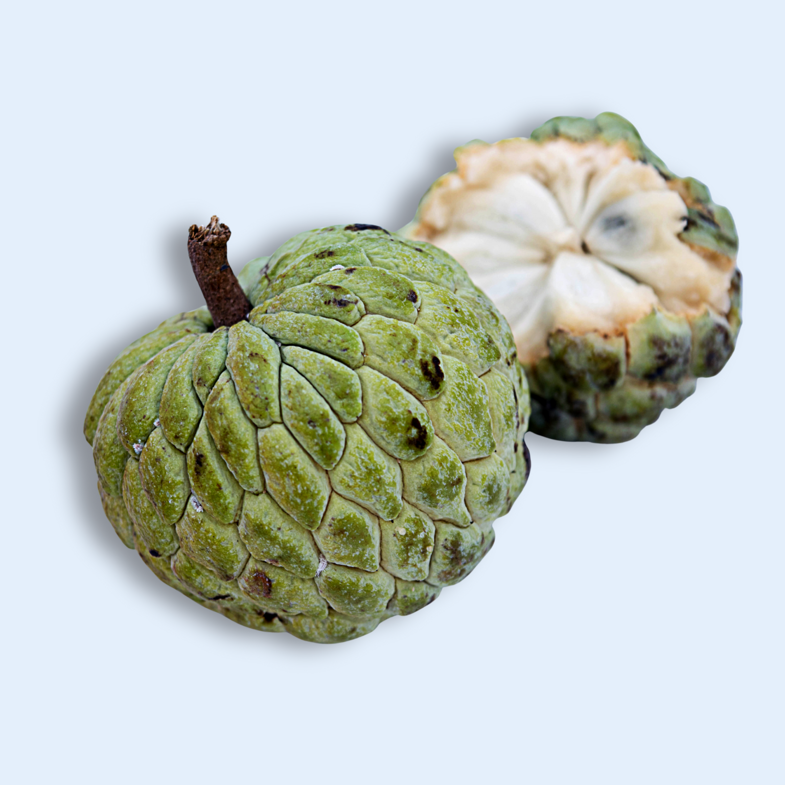 Custard apple, also known as sugar apple or cherimoya, is a green, cone-shaped fruit with soft, creamy white flesh and a sweet, tropical flavor. Its texture is smooth and custard-like, making it a popular choice for fresh eating, smoothies, and desserts.