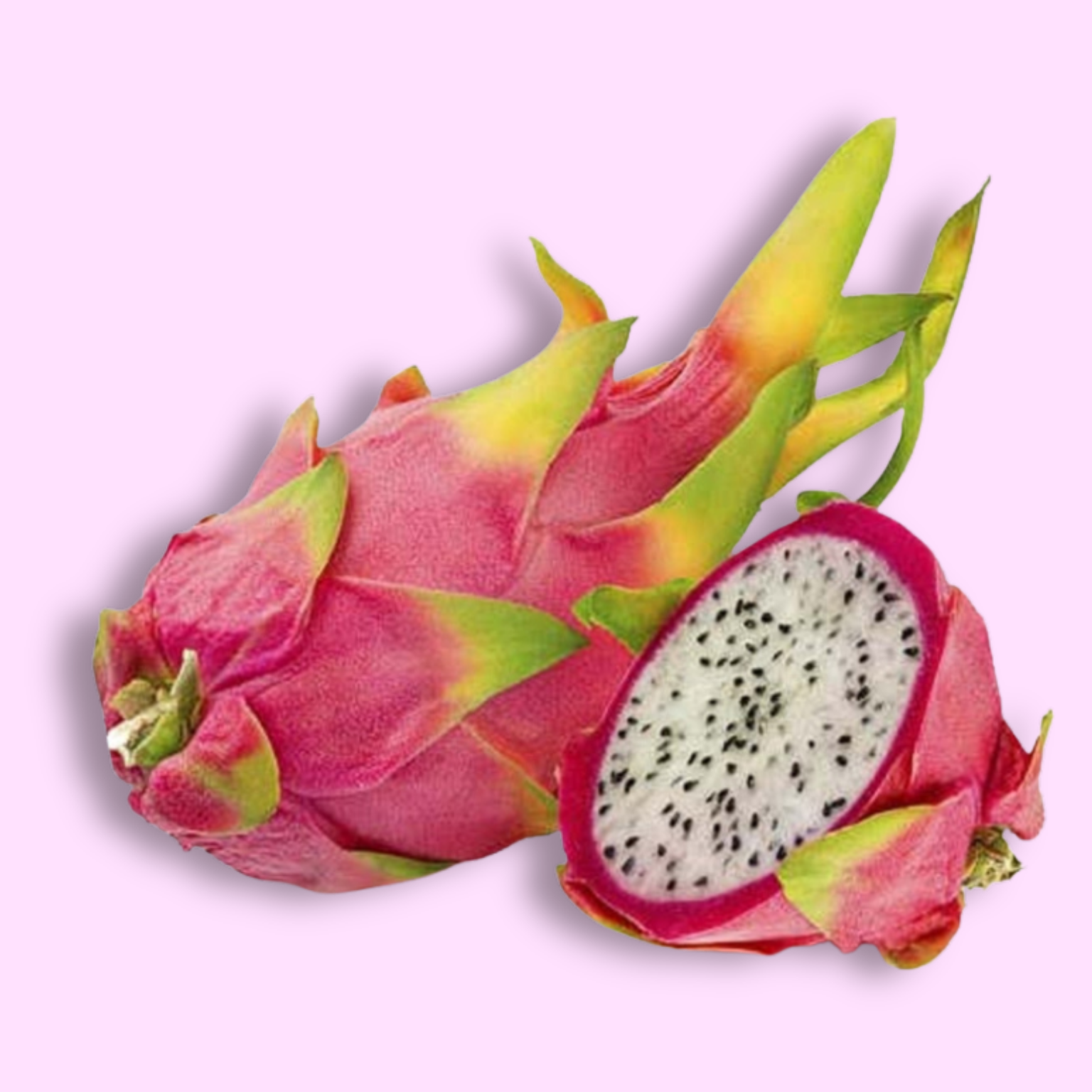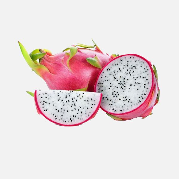 White dragon fruit, also known as pitaya, has a bright pink outer skin with green-tipped scales and white flesh speckled with tiny black seeds. It has a mildly sweet, refreshing taste with a soft, juicy texture. It is commonly eaten fresh, in smoothies, or as a salad ingredient.
